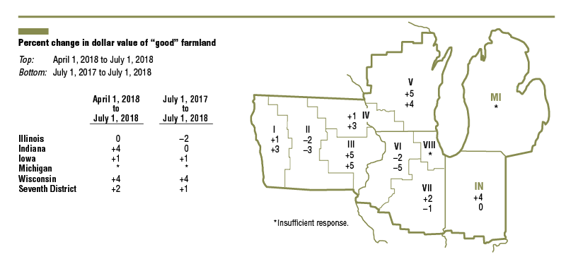 Farmland values for the Seventh Federal Reserve District edged up 1 percent in the second quarter of 2018 from a year earlier. Moreover, values for “good” agricultural land in the District increased 2 percent from the first quarter to the second quarter of 2018, according to a survey of 177 agricultural bankers. Overall, District farmland values were steady in the first half of 2018 even amid ongoing trade disputes. About three-fourths of survey respondents expected District agricultural land values to be unchanged during the third quarter of 2018 (only 2 percent expected them to increase, while 22 percent expected them to decrease). Thus, the near-term outlook for District farmland values appeared to be stable.