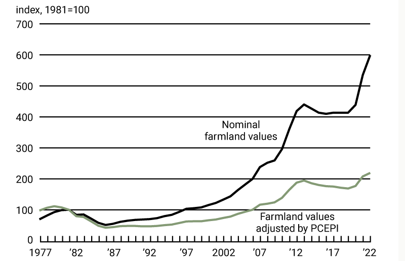 Adjusted for inflation by the Personal Consumption Expenditures Price Index (PCEPI), District farmland values experienced an annual increase of around 5 percent in 2022—the second-largest real increase of the past ten years (see chart 1). District farmland values climbed to a new peak in 2022. At the end of 2022, District farmland values were up 12 percent from their prior peak (in 2013) in real terms; they were up 36 percent from their 2013 peak in nominal terms (see chart 2).