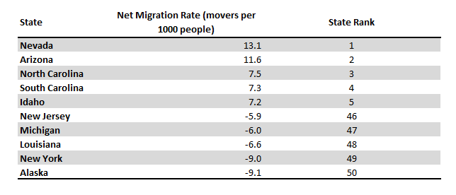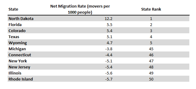 The U.S. Census Bureau’s American Community Survey (ACS) looks at annual migration flows. Table 1 shows both the top five states and the bottom five states by domestic net migration rates over the period 2001–10. One can see that Michigan had one of the highest domestic out-migration flows among the 50 states during that decade.
