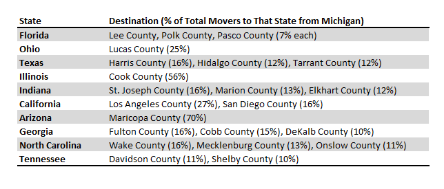 Table 4 shows some of the top destinations for Michigan residents based on the ACS five-year survey of domestic migration between 2005 and 2009.