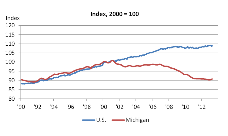 Employment levels in Michigan have recently shown signs of improvement. In fact, since the end of the Great Recession in mid-2009, Michigan’s household employment has increased 2.6%, matching the national gain. However, these recent improvements belie Michigan’s poor employment conditions stemming from a long period of subpar economic growth. Indeed, Michigan experienced a “one-state recession” for most, if not all, of the first decade of the twenty-first century.