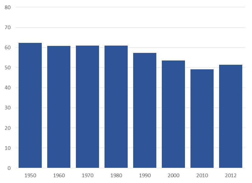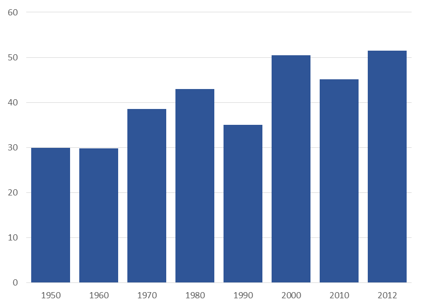 And while there are many technologically advanced industries in Michigan—including bio-pharma, medical equipment, industrial chemicals, and office furniture—automotive engineering has come to dominate further in recent decades. As the chart shows, automotive engineers once comprised 30 percent of engineers in all industries in Michigan. By 2012, their share had risen to 51 percent.