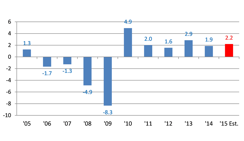 U.S. light vehicle (car and light truck) sales remain a bright spot for Michigan manufacturing. Light vehicle sales for September 2015 were reported to be 18.1 million units at a seasonally adjusted annual rate (SAAR). This was the best month for light vehicle sales since July 2005, when the U.S. light vehicle sales at a SAAR reached 20.6 million units. Year-to-date sales have averaged 17.2 million units on a SAAR basis. According to the forecast from the October 2015 Blue Chip Economic Indicators, light vehicle sales for the United States are expected to reach 17.2 million in 2015, with an additional increase in 2016 to 17.3 million units. According to data from Ward’s Automotive, Michigan’s light vehicle production for 2015 is expected to reach slightly over 2.4 million units. This would be an increase of 8.5% from 2014.