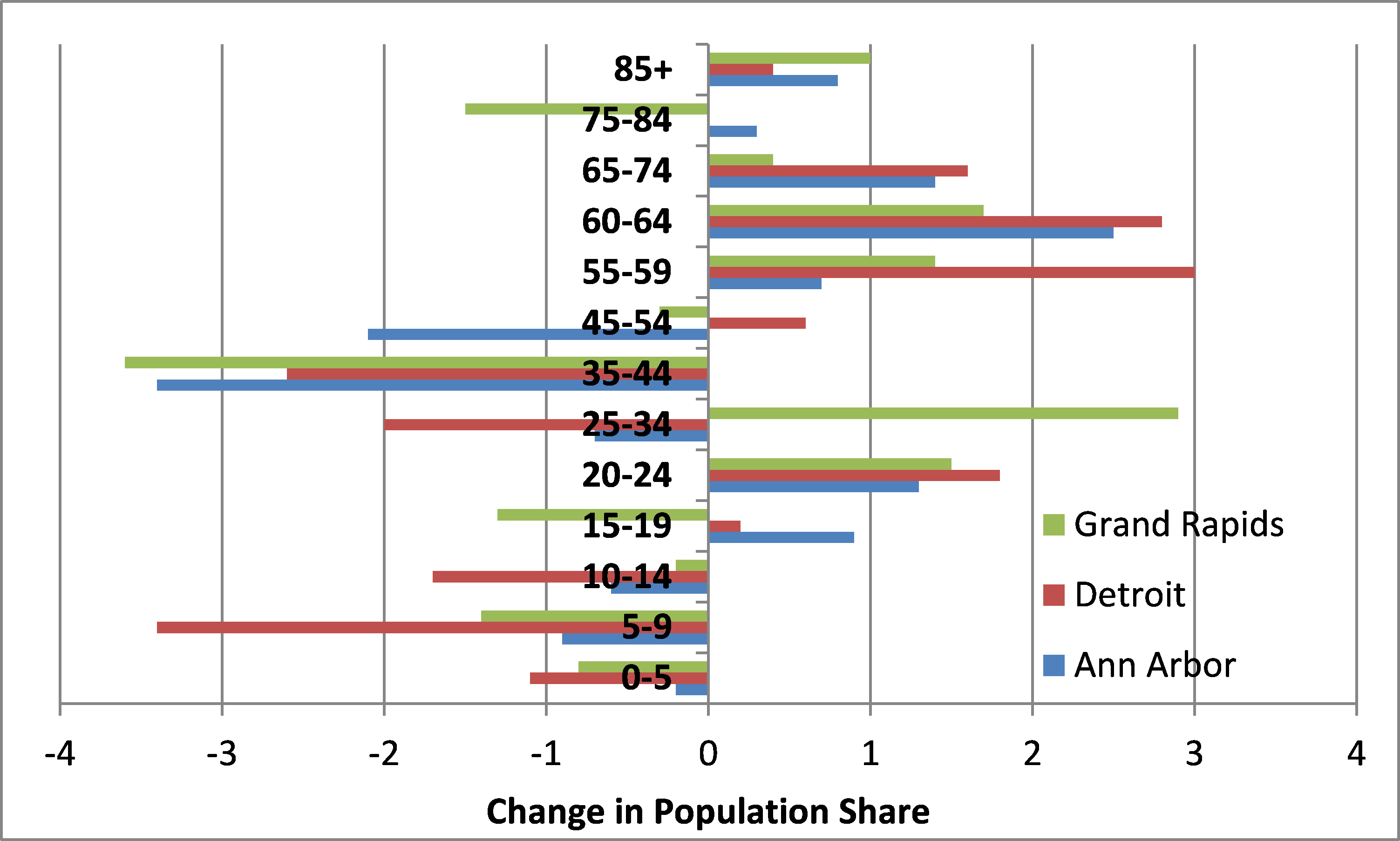 Chart 1: Change in Population Share by Age Group, 2000-2014: Ann Arbor, Detroit, Grand Rapids