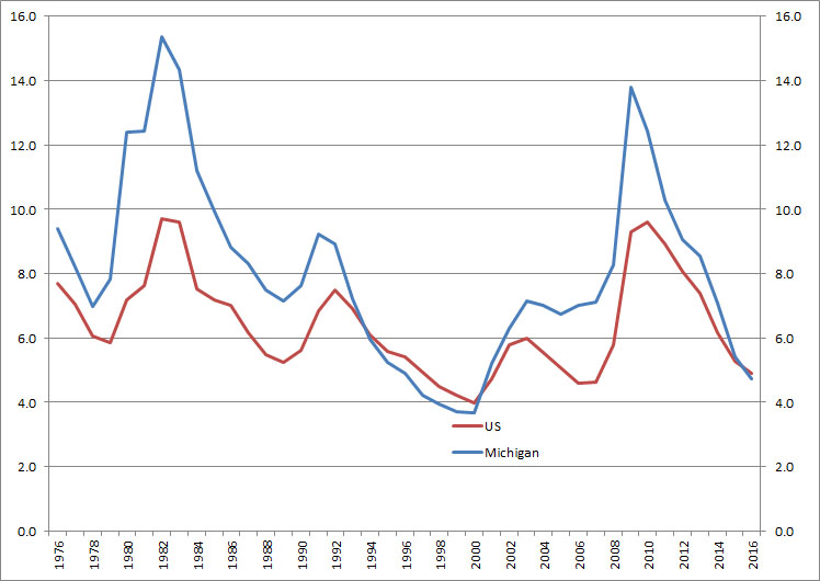 Chart 1. Unemployment Rates, Annual Averages: U.S., Michigan Analysis