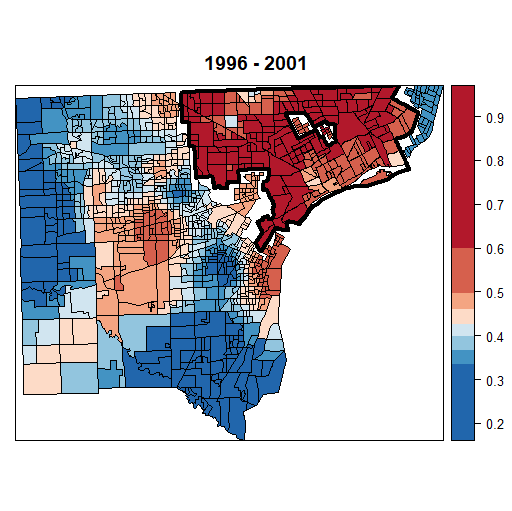 Significant changes were made to how state and local revenues would be collected and used between 1996 and 2001. Dennis Archer replaced Coleman Young as the mayor of Detroit (in 1994) and added to city payrolls, which raised the disposable income of the city at the cost of unbalancing Detroit’s budget. Also, Proposal A, Michigan’s large school-reform bill,4 flushed Detroit Public Schools with additional cash, adding to the district’s appeal. And state revenue sharing hadn’t been cut yet, giving city government additional resources for services. A lot of economic and fiscal factors worked in Detroit’s favor during the 1990s, most likely making positive impacts on the city’s housing market. However, the next decade would reveal the mistakes of increasing government spending as Detroit’s population (i.e., its tax base) continued to shrink.