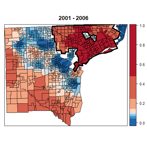 The results in map 1 are in line with Detroit’s economic narrative at the time. Detroit enjoyed an economic boom in the first half of the 1990s (following the brief national recession of 1990–91). One factor that specifically helped Detroit back then was low oil prices, which boosted sales of sport utility vehicles (SUVs) made by the Detroit Three automakers (Chrysler, Ford, and General Motors). Higher profits at the Detroit auto manufacturers had a positive ripple effect on the local and regional economies. Another factor helping the Detroit area was stable public finances. An often overlooked achievement of the 1990s was the fact that Mayor Coleman Young’s administration balanced Detroit’s budget before his tenure ended in the mid-1990s.