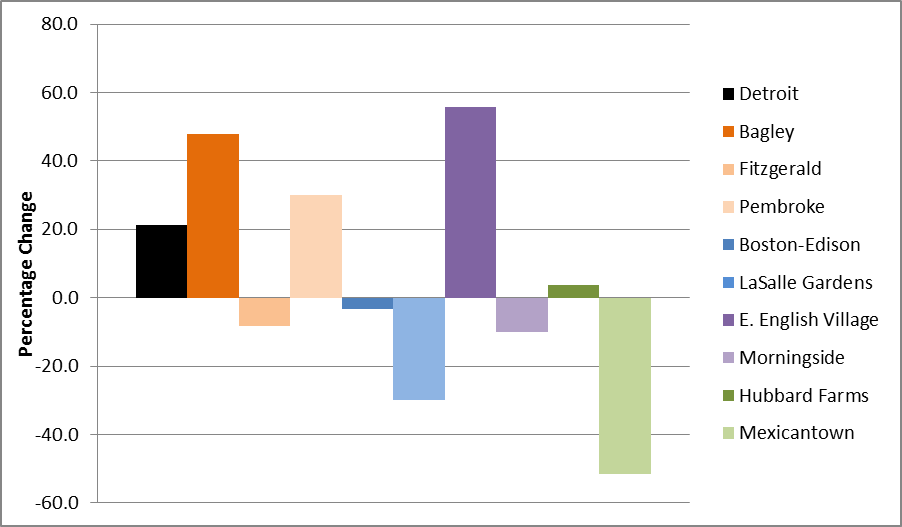 During the period 2010–15, Detroit’s median home sale price rose 21%. Over those years, Bagley and East English Village saw home prices increase more percentage wise than the city as a whole.20 Median home sale prices in all four demonstration neighborhoods outperformed those of their adjacent neighborhoods. Only four neighborhoods saw positive changes in their median home sale prices. Median home sale prices for three of the four demonstration neighborhoods (the exception being Boston–Edison) were higher in 2015 than in 2010 (before Mayor Bing’s initiatives began). The same can only be said of one of the neighborhoods used for comparison, Pembroke, which is south of Bagley in northwest Detroit. Despite these findings, it should be noted that the demonstration neighborhoods began the period with higher home sale prices than the neighborhoods adjacent to them.