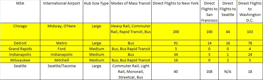 Chicago possesses the flexibility for Amazon to locate anywhere in its metro area because of the various modes of mass transit available to Chicagoland commuters. Milwaukee’s bus rapid transit lines offer some flexibility as well as to potential HQ2 locations. Chicago and Detroit provide an adequate number of air connections to Amazon’s most important North American metropolitan areas. In addition, O’Hare and Detroit Metro Airports are large enough to potentially adjust operations and increase connections.