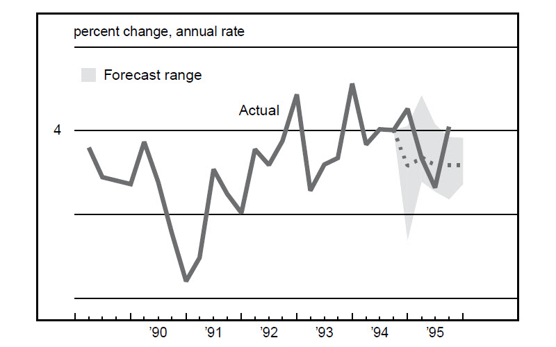 Among components of real GDP which were stronger than forecast were personal consumption expenditures, business fixed investment, and change in business inventories. However, many of the other economic series (both components and indicators) that are used to measure strength in the economy were weaker than expected, including residential construction, net exports, and government expenditures. Industrial production, which was forecast to increase by 3.6%, averaged a growth rate of 3.1% over the four quarters. Sales of cars and light trucks, which were expected to average 15.3 million units, fell short by nearly half a million units. The 1995 forecasts were too pessimistic on the unemployment rate, which was 0.3% lower than forecast. Many of the forecasters expected the inflation rate to increase to 3.5% from an average 2.8% for the previous four quarters; in fact, it averaged 2.7%. Overall, the forecasters were surprised by the strength in the economy in 1995, especially in business fixed investment, and the relative weakness in the rate of inflation.