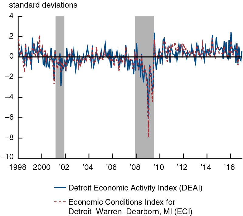 One way to measure Detroit’s economic progress since exiting bankruptcy would be to use the Federal Reserve Bank of St. Louis’s monthly Economic Conditions Index for Detroit–Warren–Dearborn, MI. The St. Louis Fed’s index—which we’ll refer to as the ECI for short—is constructed using a dynamic factor model that includes 12 data series measuring various aspects of growth in economic activity in the Detroit metropolitan statistical area (MSA) and is calibrated to its gross metropolitan product (GMP) growth.2 However, the ECI does not measure the economic conditions of the city of Detroit separately from those of the broader MSA. Because of this, we construct a new measure of Detroit-specific economic conditions that we call the Detroit Economic Activity Index (DEAI). Like the ECI, the DEAI is also constructed using a mixed-frequency dynamic factor model, but includes 23 Detroit-specific data series capturing income, employment, residential and commercial real estate activity, electric customer counts, tax revenues, and port activity.3 The DEAI is calibrated so that Detroit’s historical growth trend (average) equals zero, meaning that an index value greater than zero implies the city’s economic activity is growing faster than trend and, conversely, a value less than zero implies its activity is growing slower than trend. The index is then measured in standard deviation units from trend growth. The limited availability of many of the data series that make up the DEAI restricts how far back it goes in comparison with the ECI; the DEAI’s history extends back to only 1998.