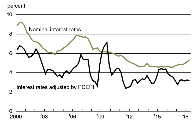 Given lowered farm income projections, anticipating declines in agricultural land values would not be out of order. According to an asset valuation model, the present price of an asset (such as farmland) should reflect both current profitability and expectations for discounted future earnings. The discount factor should move in the opposite direction of interest rates, such that higher interest rates tend to lower asset values (and vice versa). In the second quarter of 2018 and other recent quarters, nominal interest rates on agricultural loans moved up. As of July 1, 2018, District average interest rates on new farm operating loans, feeder cattle loans, and real estate loans had risen to 5.69 percent, 5.75 percent, and 5.28 percent, respectively. However, after being adjusted for inflation (which picked up in 2018) with the Personal Consumption Expenditures Price Index, all these interest rates ticked down over the second quarter of 2018. In particular, the average real interest rate for farm real estate loans dipped 13 basis points (see chart 1). On average, real interest rates on farm mortgages have remained low over the past two years (and have returned to the levels seen during the peak of farmland values in 2013). This divergence between nominal and real interest rates could help explain the general stability of farmland values since 2016, as the discount factor implied by lower real interest rates helped offset some of the weakness in farm incomes. Thus, the direction of average real interest rates on farm loans bears watching for a clue as to potential movements in agricultural land values.