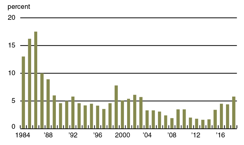 Agricultural credit conditions in the second quarter of 2018 deteriorated relative to a year earlier yet again. Overall, repayment rates for non-real-estate farm loans were lower in the second quarter of 2018 compared with the second quarter of 2017; this marked the 19th consecutive quarter of deteriorating repayment rates relative to a year ago. The index of loan repayment rates was 64 for the second quarter of 2018 (1 percent of responding bankers noted higher rates of loan repayment than a year ago and 37 percent noted lower rates). The percentage of farm loans with “major” or “severe” repayment problems (5.8 percent of the District loan portfolio) was last higher in 2002, as measured every second quarter of the year (see chart 2). The highest concentrations of loans in these categories were found in Indiana and Michigan. Also, renewals and extensions of non-real-estate farm loans during the April through June period of 2018 were higher than during the same period of a year ago, as 35 percent of survey respondents reported more of them and 3 percent reported fewer of them.