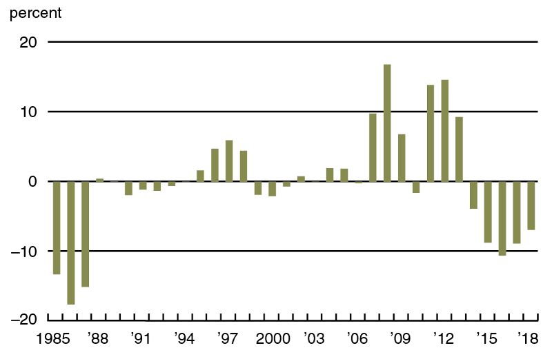 1. Annual percentage change in Seventh District farmland cash rental rates adjusted by PCEPI
