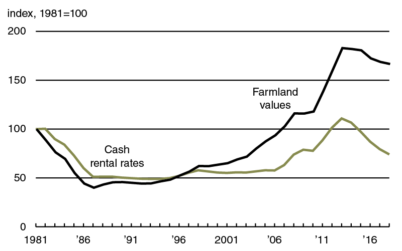 Agricultural land values for the Seventh Federal Reserve District showed signs of stabilizing in the first quarter of 2018, as farmland values were unchanged from a year ago. On average, “good” farmland values in the first quarter of 2018 rose 1 percent from the fourth quarter of 2017, according to the survey responses of 181 District agricultural bankers. The amount of farmland for sale in the three- to six-month period ending with March 2018 was slightly higher than in the same period ending with March 2017. Yet, the demand to purchase agricultural land, the number of farms sold, and the amount of acreage sold were slightly lower during the winter and early spring of 2018 compared with a year ago. More of the responding bankers expected District farmland values would decrease rather than increase during the second quarter of 2018; but three-fourths of them expected agricultural land values to be stable. Additionally, cash rental rates for District farmland decreased again in 2018; however, their year-over-year decline of 5 percent was smaller than the decline recorded for 2017.