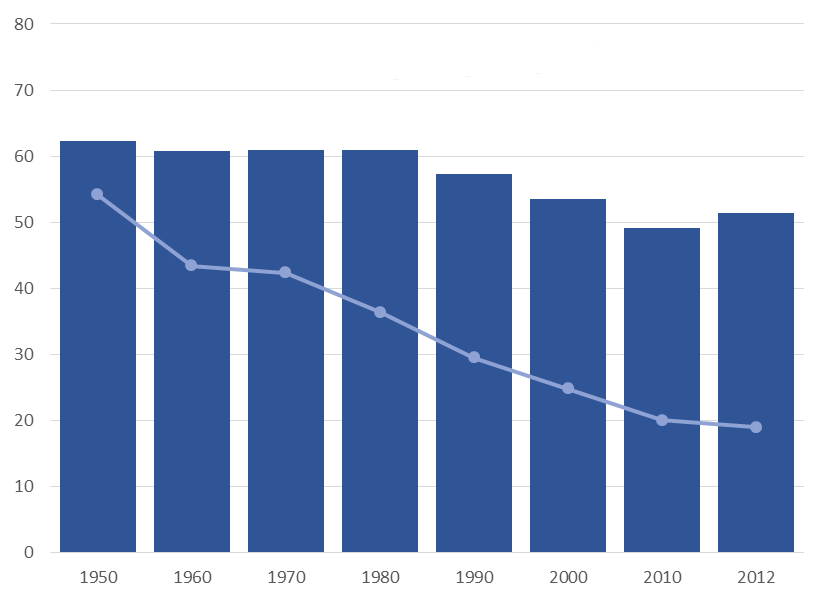 And while there are many technologically advanced industries in Michigan—including bio-pharma, medical equipment, industrial chemicals, and office furniture—automotive engineering has come to dominate further in recent decades. As the chart shows, automotive engineers once comprised 30 percent of engineers in all industries in Michigan. By 2012, their share had risen to 51 percent.