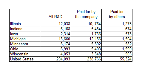 Automotive R&D has propelled Michigan to a leadership position among Midwest states. The table shows Michigan leading the region with $13.7 billion in total business-performed R&D by all industries in 2011, closely followed by Illinois ($12.0 billion), but far ahead of Ohio, Indiana, and Minnesota.2