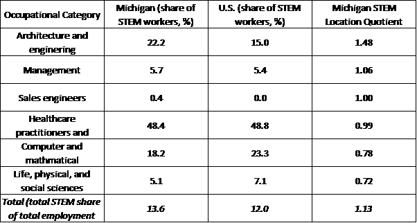 Table 2. Distribution and concentration of STEM workers by occupational category in Michigan and U.S., 2013