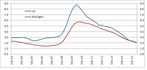 Michigan’s labor market continues to recover from the Great Recession that ran from December 2007 through June 2009 and its own recession that started four years prior to that. Michigan’s unemployment rate peaked at 14.9% in June 2009, coinciding with the end of the Great Recession. Since that time, Michigan’s unemployment rate has dropped steadily, reaching 4.5% in August 2016. The last time Michigan’s unemployment rate was this low was in January 2001, just before the much shorter and milder 2001 recession.1