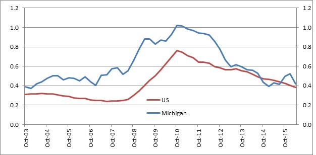 Finally, what about discouraged workers? If a labor market is tightening, the number of discouraged workers should be decreasing. The chart below shows discouraged workers as a percentage of the labor force in the U.S. and Michigan, respectively.