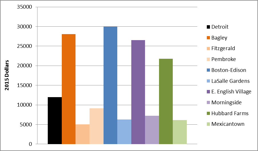 So, for over six years now, the four neighborhoods of Bagley, Boston–Edison, East English Village, and Hubbard Farms have received increased investments from the city government. Arguably, the increased government service delivery and/or police presence should have made those neighborhoods more desirable places to live. And the greater desirability of these areas should be reflected in their having higher home values now. In this blog entry, I examine the changes in home sale prices in those four neighborhoods since 2011 (when Mayor Bing began his initiatives). I also explore changes in home sale prices in the neighborhoods adjacent to the four that received investments from the city since 2011 to see if targeted neighborhood funding has made a difference.