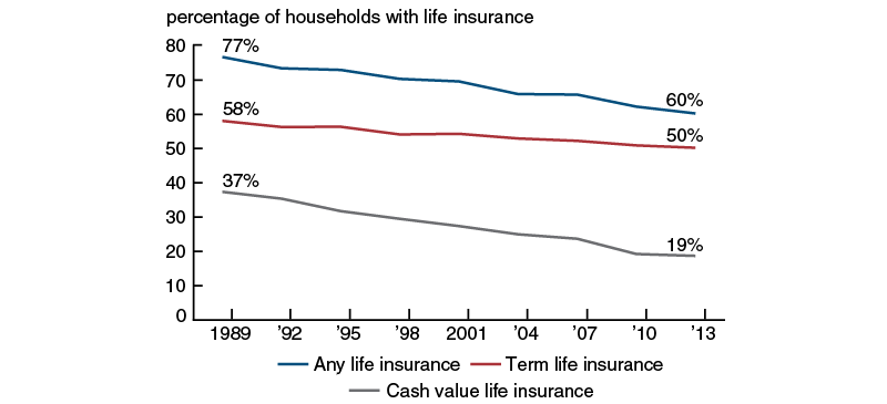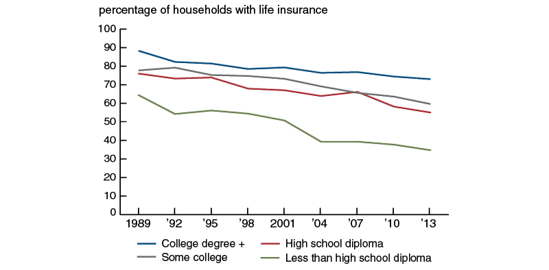 Life insurance ownership has declined markedly over the past 30 years, continuing a trend that began as early as 1960. In 1989, 77 percent of households owned life insurance (see figure 1). By 2013, that share had fallen to 60 percent. This article analyzes factors that might have contributed to the decline in life insurance ownership from 1989 to 2013. The focus of our analysis is on two broad sources of potential change in the demand for life insurance: changes in the socioeconomic and demographic characteristics of the population and changes in how those same characteristics are associated with the decision to purchase life insurance. In addition, we highlight the considerable diversity in life insurance ownership across education, income, and race and ethnicity and describe how trends in life insurance ownership vary across these groups.