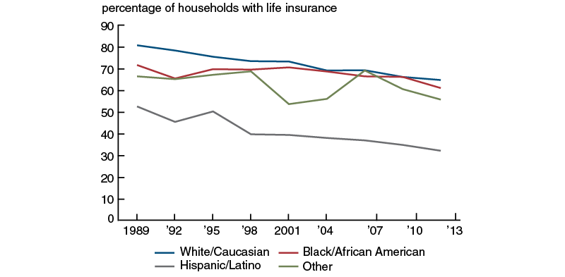 We analyze 1989 and 2013 Survey of Consumer Finances (SCF) data and find substantial differences in the propensity to own life insurance among households with different demographic and socioeconomic characteristics. One fact that stands out is the high life insurance ownership rates of African American households. African American households are more likely to own life insurance than otherwise similar white households. This is in stark contrast to African American ownership of other financial assets, suggesting that there is something special about life insurance. We speculate that one factor may be the important role of African American-owned life insurance firms from the early 1920s through the 1960s (Heen, 2009; and Chapin, 2012). Another possible explanation is that higher mortality rates for African Americans make it optimal for more African Americans than whites to choose to own life insurance. However, there is evidence that African Americans, on average, expect to live six years longer than their actuarial life expectancy while whites’ subjective and actuarial life expectancies are much closer (Mirowsky, 1999). Deepening our understanding of the high rates of life insurance ownership among African Americans is an important topic for future research.