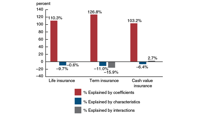 Of course, this is not what happened. Instead of a slight increase in life insurance ownership, we observe a significant decline. According to our estimates, much of the explanation for this drop is due to changes in the estimated coefficients—or the likelihood that a household with a given characteristic purchases life insurance. This can be seen by comparing the second bar in figure 5 with the fourth bar. The height of the second bar corresponds to the share of 2013 households that would have been predicted to buy life insurance if they behaved like 1989 households. The fourth bar shows the share of 2013 households that actually bought life insurance. The difference in predicted ownership is stark. With 1989 behavior, 78.4 percent of 2013 households would have been predicted to own life insurance; instead the actual prevalence of life insurance ownership among these households is 60.2 percent. We see similar patterns for term and cash value insurance: 60.6 percent predicted ownership versus actual ownership of 50.2 percent for term and for cash value a predicted ownership rate of 38.0 percent and an actual rate of 18.7 percent.