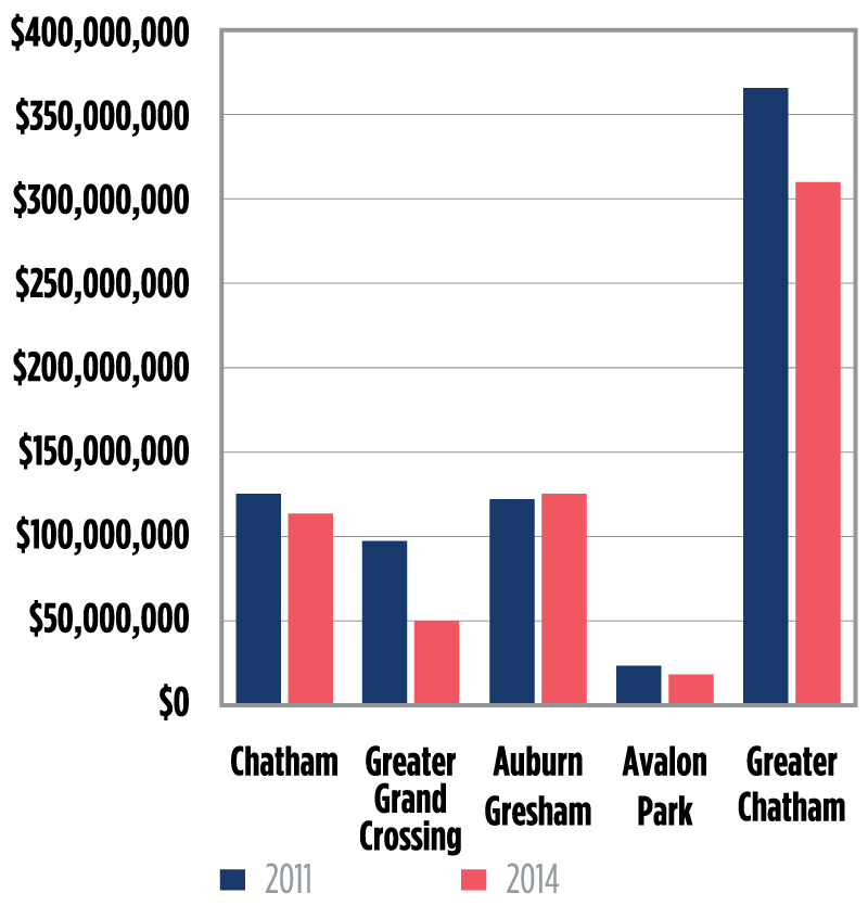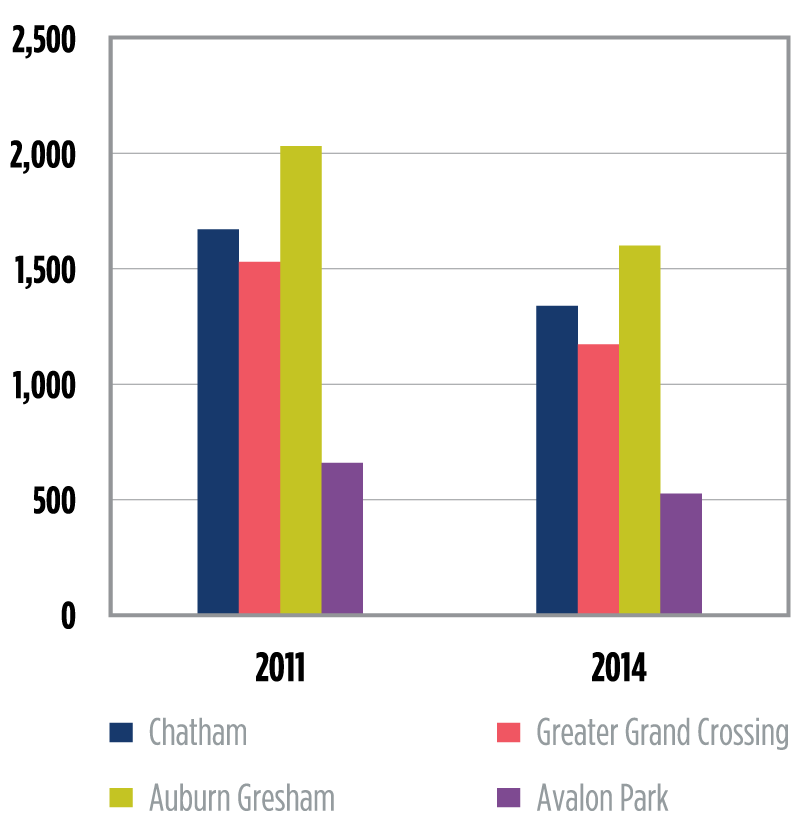 The decline in population and income in Greater Chatham has coincided with weakening business performance.11 Establishment (i.e., business) counts have fallen in Greater Chatham since the 2008-2010 recession, as they did in the city of Chicago overall. The number of businesses fell by 22 percent between 2011 and 2014 (the latest year available), compared to a drop of about 15 percent in the city of Chicago. This means that Greater Chatham went from having more than 6,000 businesses to having fewer than 5,000 businesses, though places within Greater Chatham varied with respect to the number of businesses per capita compared to the city of Chicago. As of 2014, Avalon Park had five businesses per 100 people – on par with the rate for the city as a whole. By contrast, the communities of Auburn Gresham and Greater Grand Crossing had between three and four businesses per 100 people. This signals some potential gaps in the presence of business in those communities.12