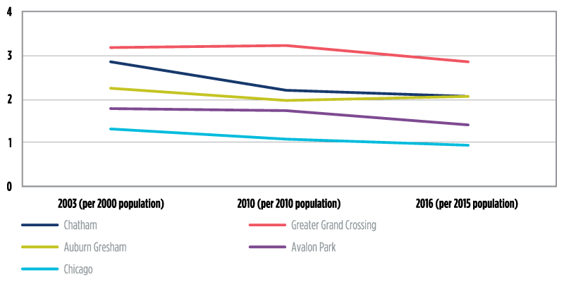 Such conditions are perhaps one of the reasons for the almost twice-as-high rate of violent crimes (per capita) in Greater Chatham compared to the rest of the city. Although violent crimes decreased in Greater Chatham between 2003 and 2016, the per-capita rate remained higher than in the city as a whole (figure 7). Joblessness and falling incomes may also help explain Greater Chatham’s lingering foreclosure rates (as of July 2017) – ranging from 3 percent to 10 percent in the surrounding zip codes8 – compared to a rate of less than 1 percent for the city of Chicago.