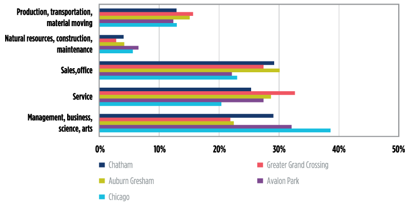 Recent trends in occupational and industry composition of the workforce provide an additional indicator of the near-term prospects for job growth in Greater Chatham. A relatively high proportion of workers are employed in sales and office occupations, as well as in service, management, business, science, and arts occupations, mirroring the occupational composition of the Chicago labor force as a whole (figure 8). The concentration of transportation and manufacturing traded clusters, and the presence of local clusters with retail trade businesses, as well as major anchor institutions including hospitals and universities, are also reflected in the data for employer industries.9 A relatively high proportion of workers in Chatham are employed in education, health services, transportation, and warehousing11 (figure 8). The data, however, suggest a loss of competitiveness in Greater Chatham following the 2008-2010 recession, when comparing job growth in these neighborhoods to job growth in the city as a whole. From 2011 to 2015, even the sectors which traditionally employed the highest share of workers in Greater Chatham shed jobs. While the city of Chicago has seen job growth in most of its major industries, Greater Chatham has experienced job declines for its residents in each of those industries (figure 9).