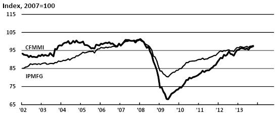 Chicago Fed Midwest Manufacturing Index and U.S. Industrial Production Index for Manufacturing, 2007 = 100